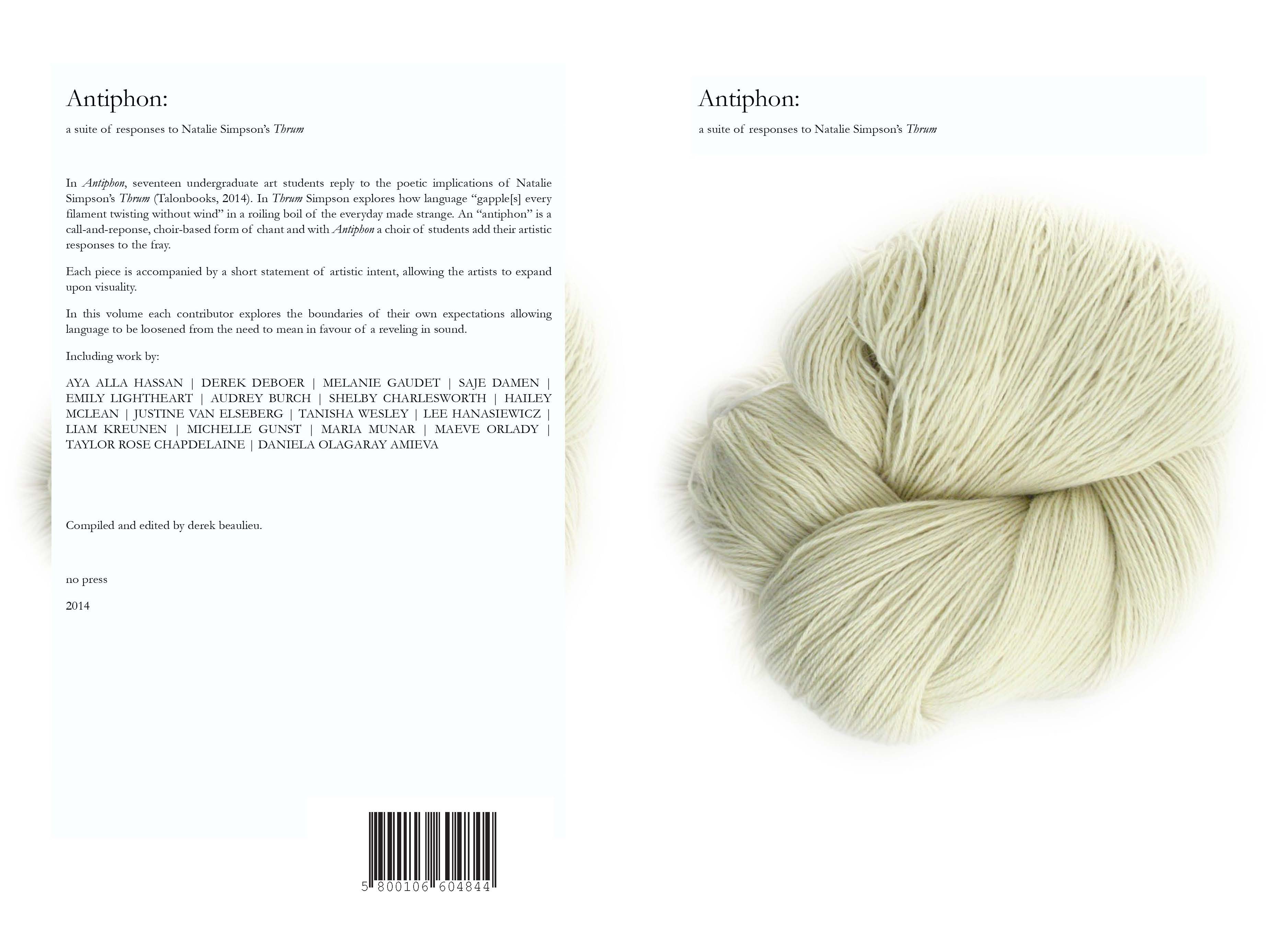 In Antiphon, seventeen undergraduate art students reply to the poetic implications of Natalie Simpson’s Thrum (Talonbooks, 2014). In Thrum Simpson explores how language “gapple[s] every filament twisting without wind” in a roiling boil of the everyday made strange. An “antiphon” is a call-and-response, choir-based form of chant and with Antiphon a choir of students add their artistic responses to the fray.