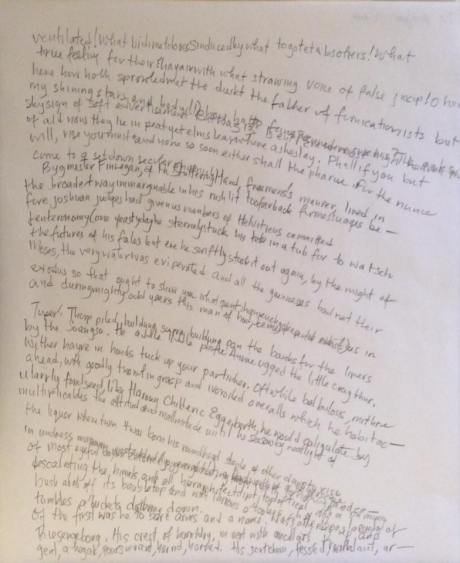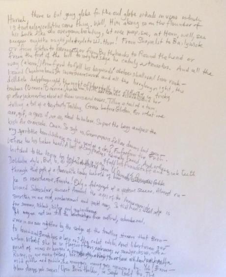 The first five pages of James Joyce’s Finnegans Wake, handwritten while reading & without looking at the artwork; a blind-contour rendering of Joyce’s book of the dark. 14″ x 17″, pencil on layout bond.