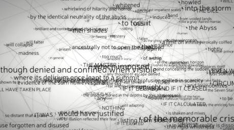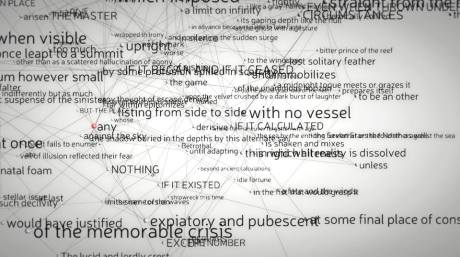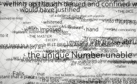 Mallarme’s “Un Coup de Des” (here in English translation by Robert Bononno and Jeff Clarke from the 2015 Wave books edition) is a foundational text for the exploration of page design, typography & type size and the tension of varied directions in reading. Using 3DPoetryEditor , I have tossed Mallarme’s poem in to the tempest of stormy digital waves, the lines of the poem left to eddy and crash against each other, creating a whirling tension of recombinant text.