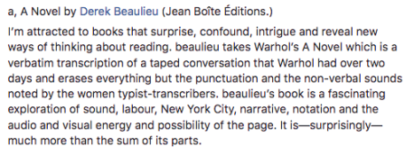 a, A Novel has recently had a few small reviews – from Hamilton’s Gary Barwin, Darwin, Australia’s Christian Bök, and Germany’s Laurent Sauerwein . . .
