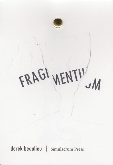 derek beaulieu’s Fragmentum is a 5×7″chapbook of 6 pages printed in an edition of 55 copies. A sturdy little chapbook printed entirely on cardstock and bound with a butterfly clip for a slightly different navigational process.
