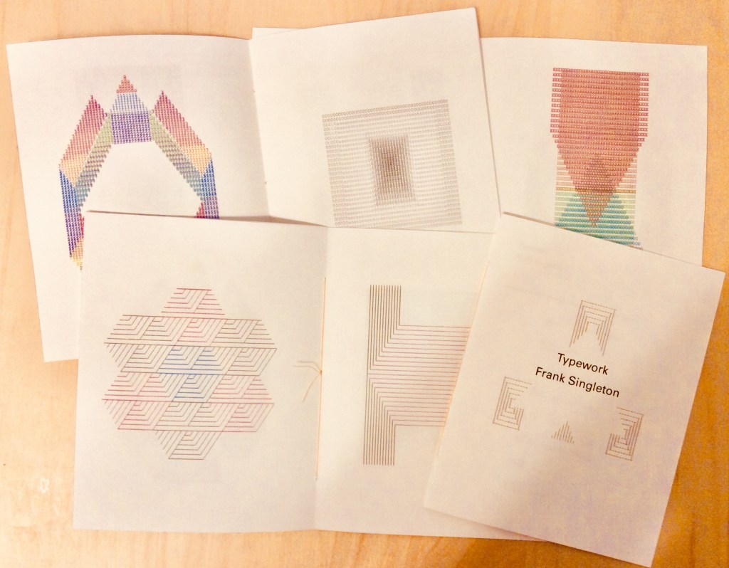 TYPEWORK features 8 examples of Frank Singleton’s beautiful abstract typewriter artworks, 7 of which are in full colour, 1 in B&W — and all of them delicate productions of typewritten geometrics.