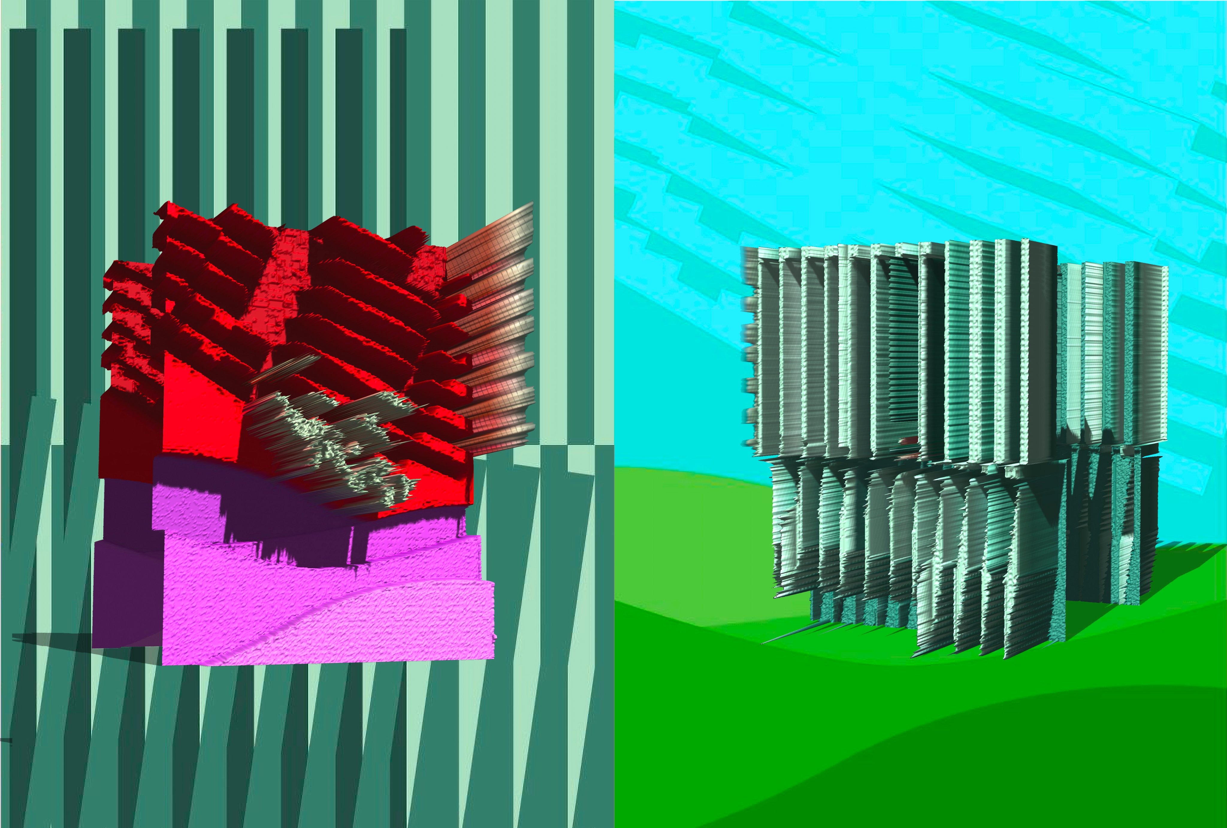 Gary Barwin has rendered a sample from Rhys Farrell & my Lens Flare using the “Depth map to two-sided plane” 3D process on Photoshop and has created a glitch-based digital structure. This blown-out digital rendering imagines the visual poems of Lens Flare as strange buildings – thank you so much Gary!