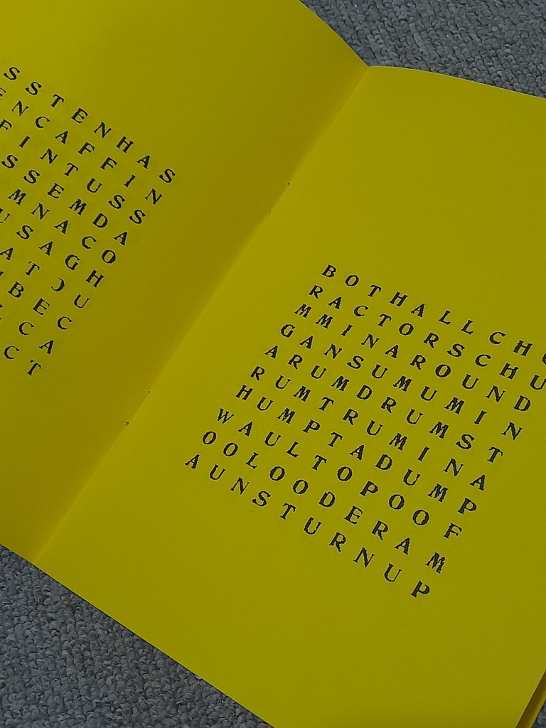 There are ten “thunderwords” in James Joyce’s Finnegans Wake, the first nine are 100 letters long, the last 101. While they are aurally constructed to sound like thunder, they are not purely onomatopoetic words: they are assembled from multi-linguistic words and fragments. These 10 pieces (pencil and rubber-stamp on newsprint; image size 12″x12″, paper size 18″x24″) reproduce Joyce’s thunderwords as 10×10 grids, each a perverse word-search puzzle.