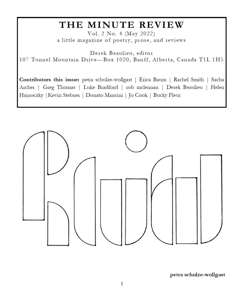 The Minute Review Vol. 2 #4 includes work by schulze-wollgast, Erica Baum, Rachel Smith, Sacha Archer, Greg Thomas, Luke Bradford, rob mclennan, Helen Hajnocky, Kevin Stebner, Donato Mancini, Jo Cook, Bucky Fleur, and the editor.