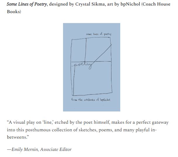 Huge congrats to Crystal Sikma who received the “The Semi-serious, Semi-annual Bookworm Book Cover Award” from The Literary Review of Canada for her cover design for SOME LINES OF POETRY (as edited by Gregory Betts and I for Coach House Books)