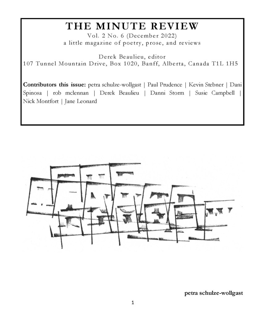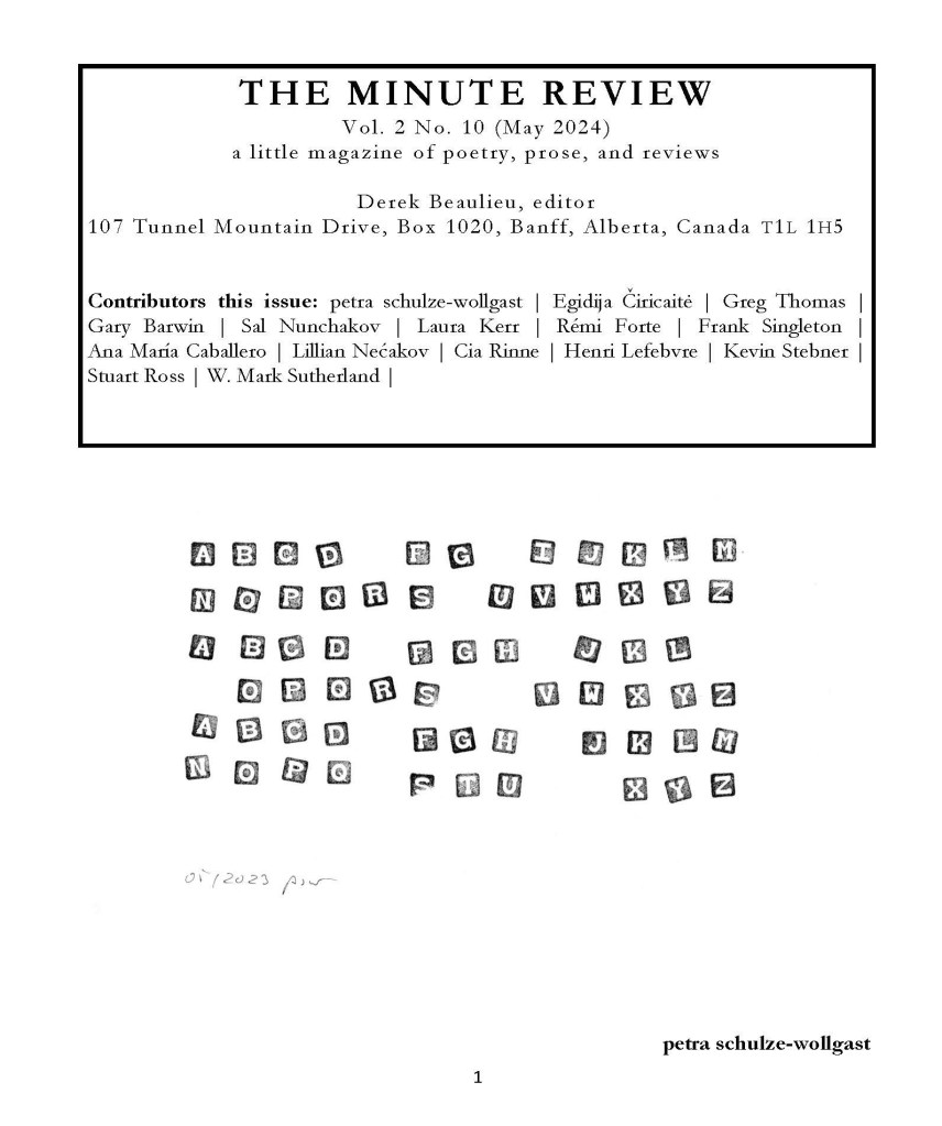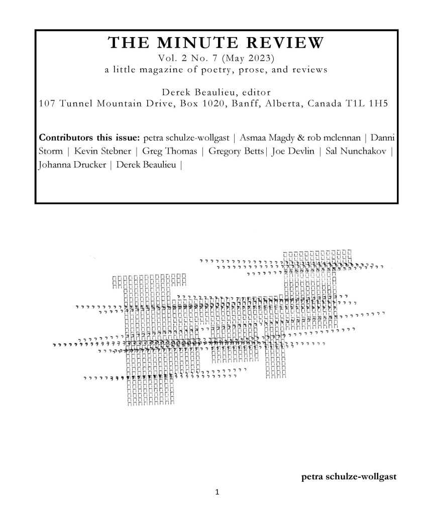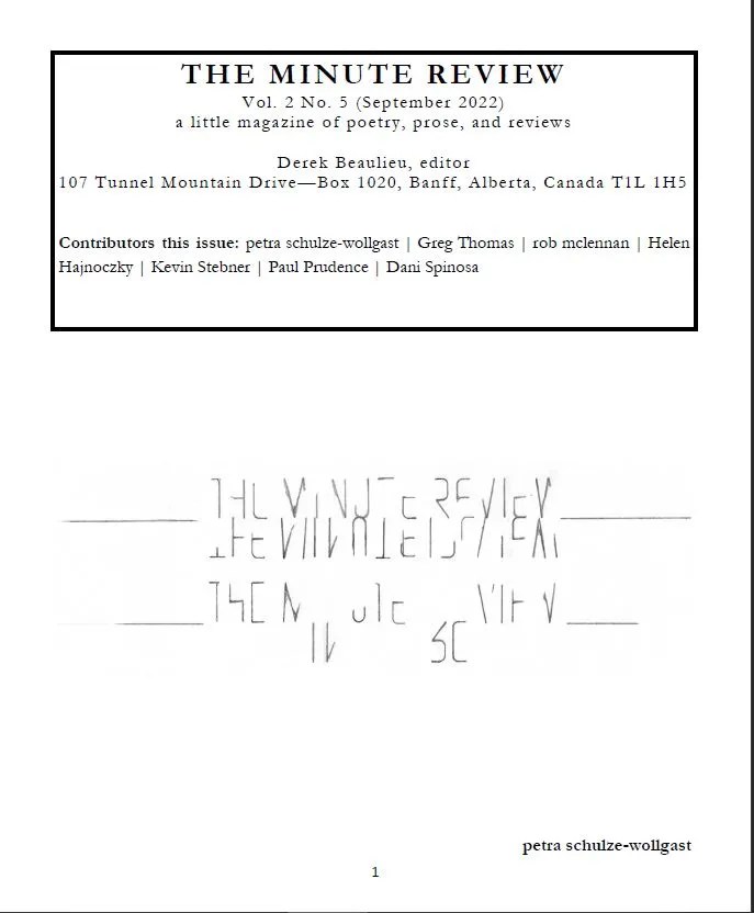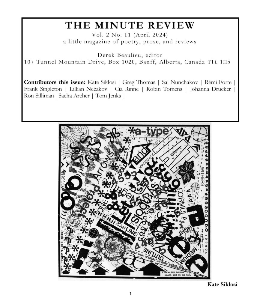 I had work published in The Rocky Mountain Outlook, Westword, Periodicities, ctrl+alt+del, Arc, Oesa, Petrichor, The Penetang Review, The Stony Thursday Book, and Right Click Save and in the anthologies Poème Objkt Sbjkt, Report from the Smith Society Vol. 1, Interpoem: A Visual Anthology, and, in translation, in Nouvelles de l’Alberta: Anthologie de textes littéraires / Alberta Shorts : An Anthology of Literary Texts.