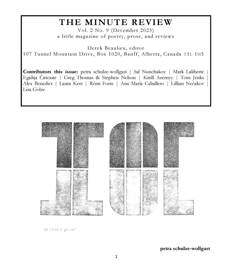 There were also 8 different small press editions of my work published in 2023: Ontario Hydro and a 2nd edition of Tattered Sails (both from above/ground press), 🙂 (Anstruther Press), Future Poems (Poem Atlas), as well as UMNV, Chinook Arch, Network, and Ossification (all from my own No Press).