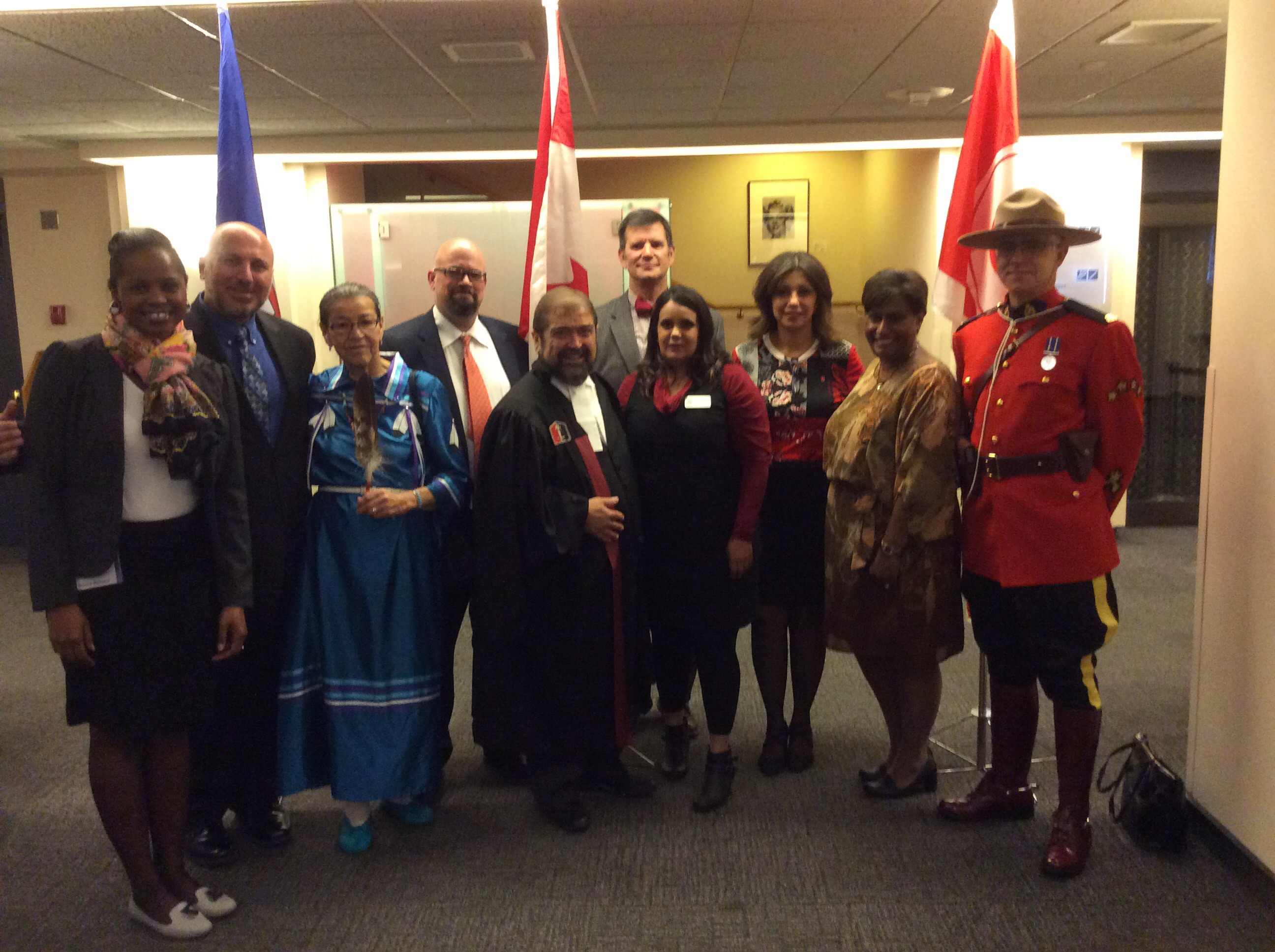 Donna Stewart, Citizenship Officer /Clerk of ceremony; unknown; Cree Elder Doreen Spence; me; Judge Joseph Woodard, Presiding Official; Johann Zietsman, President and CEO ARTS Commons; unknown; unknown; Umashanie Reddy: RBC Immigrant of Distinction Award winner; Royal Canadian Mounted Police Sergeant Conal Archer